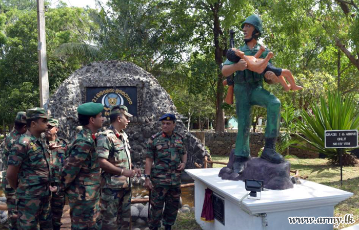 This War Hero statue was first constructed in 1995 under the aegis of retired Major General Ananda Weerasekara (currently Ven. Buddhangala Ananda Thero) when he was serving this camp as the Brigade Commander, 6 Brigade Headquarters at that time. However, the statue needed repairs and renovation with the passage of time.