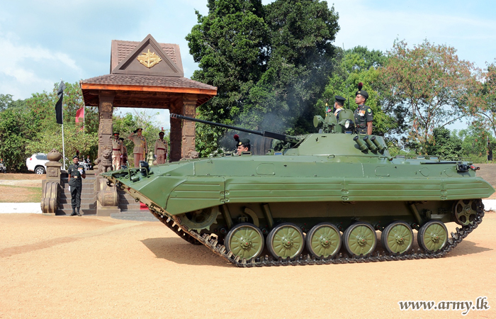 A few minutes later, to be in accordance with formalities, the outgoing Colonel of the Regiment was moved out from the Officers' Mess premises atop a WMZ 551 B Armoured Personnel Carrier (APC) amid greetings of ‘Jaya Sri’ as All Ranks lined up to bid him goodbye. |