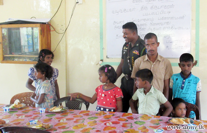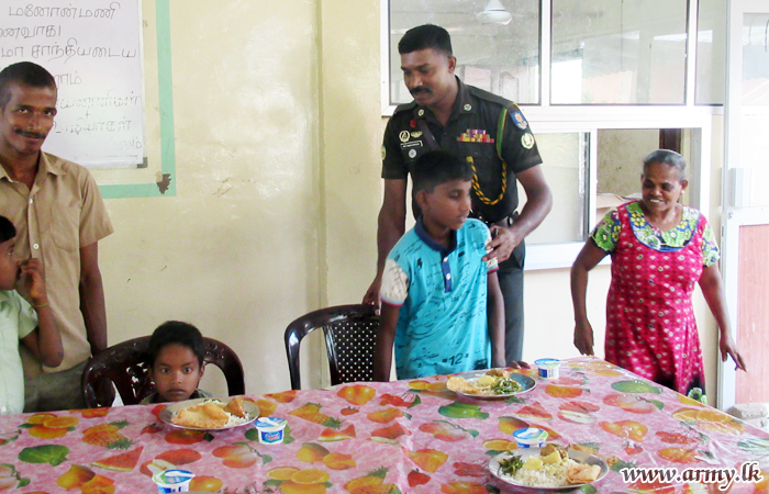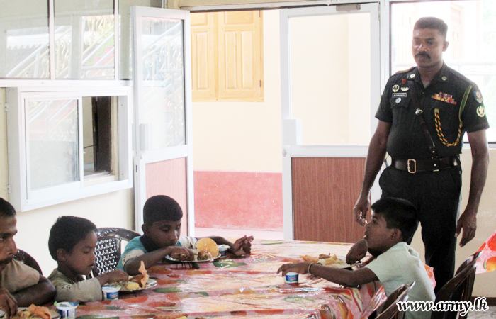 68 Division troops of the Security Force Headquarters - Mullaittivu (SFHQ-MLT) with the consent of all serving troops have volunteered to supply three major meals on every Saturday to the Iniya Walwu Illam Child Care Centre (Children’s Home) in Puthukkudiyiruppu with the hope of promoting goodwill and reconciliation.