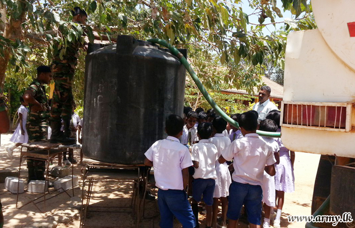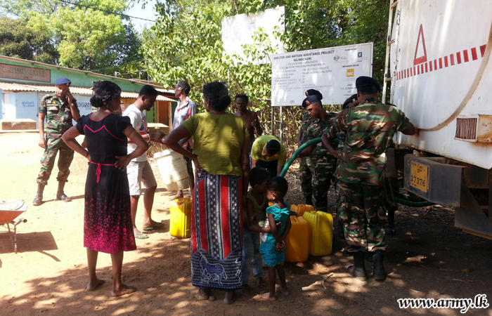 Army water bowsers with the intention of assisting drought-hit civilians commenced filling roadside plastic tanks and their personal utensils after the difficulty was brought to the notice of the 57 Division where more than 350 families, Baratheepuram School and Annaisaradha Kanista Vidyalaya are benefited in the area. The humanitarian project started on Saturday (1) after its gravity was evaluated. |