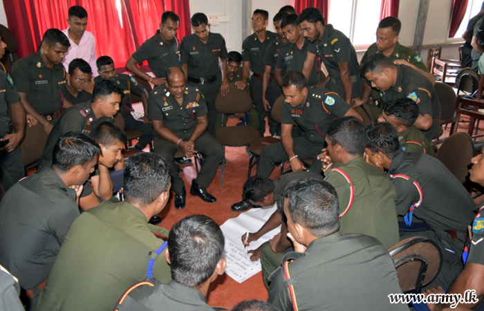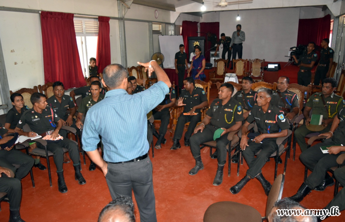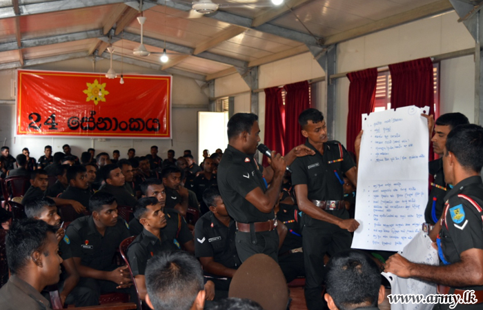 A series of lectures on topics such as the ‘Role of Army Soldiers to Establish National Reconciliation and Development’, ‘Role of Army to Mitigate Death Toll in Accidents and Suicides', ‘Role of Army Personnel to Prevent Drug Addiction', etc were delivered by eminent lecturers and resource personnel, invited to the sessions by Major General Mahinda Mudalige, General Officer Commanding 24 Division since those topics touch on current developments in society.