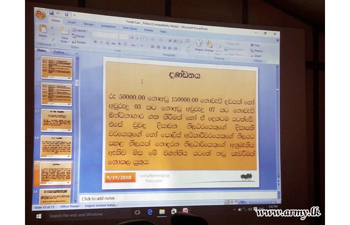 Following a new initiative of the General Officer Commanding, 57 Division, Major General Vijitha Ravipriya, an awareness lecture on ‘Forest Conservation and Forestry Laws’ was conducted by Officials of the Divisional Forest Office on Friday (21) at 571 Brigade Headquarters in Kilinochchi.