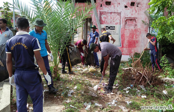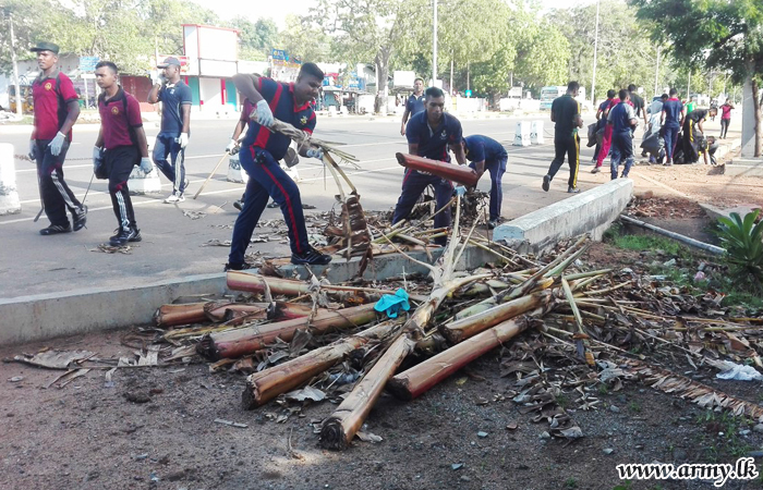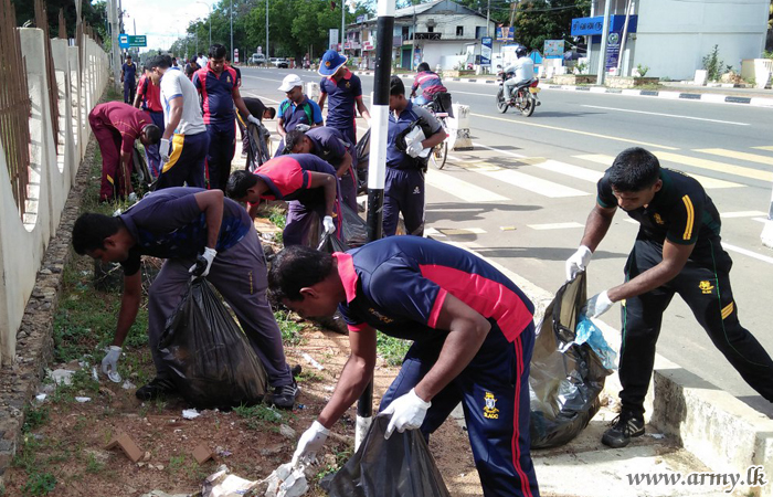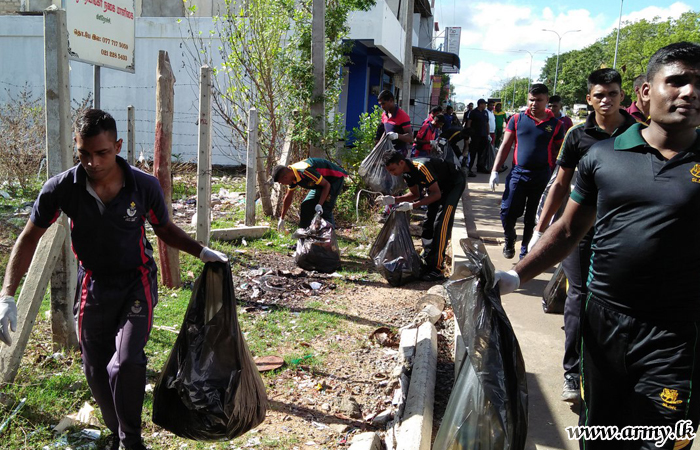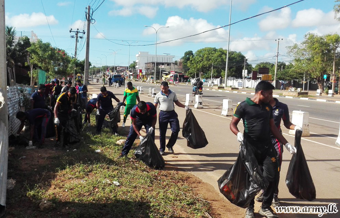 More than 10 Officers and 200 Other Ranks of the 7 of Sri Lanka Light Infantry (SLLI) and the 9 Vijayabahu Infantry Regiment (VIR) on Sunday (30) carried out a roadside cleaning project along the A9 road from the 248 km post (Iranamadu Junction) to the 256 km post at Kilinochchi town to coincide with National Mosquito Prevention week.