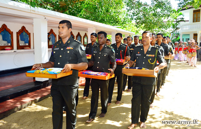 Members of the Maha Sangha, headed by Ven. Ampitiye Sumanarathana Thero, Chief Incumbent at Mangalaramaya, Batticaloa chanted ‘Seth Pirith’ and invoked blessings on flags of the SFHQ-E, FMA-East, 23 Division, 231 Brigade, 232 Brigade, 233 Brigade and all other under command Battalions.