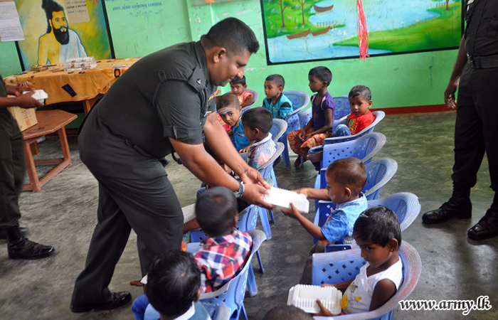 Further troops of the 1 Sri Lanka Sinha Regiment launched a food distribution campaign in line with the 69th Army Day at Pulendran pre-school by distributing lunch boxes among students and teachers on Tuesday (9). |