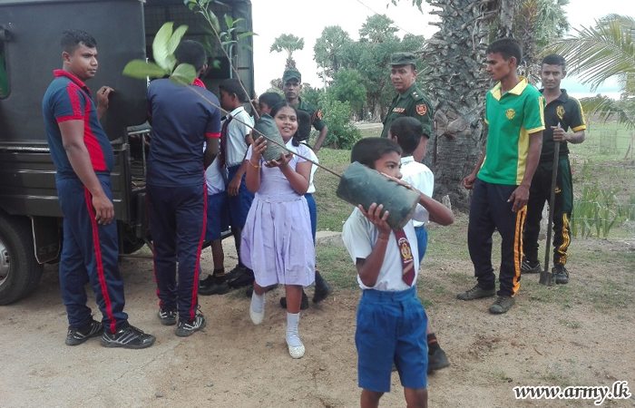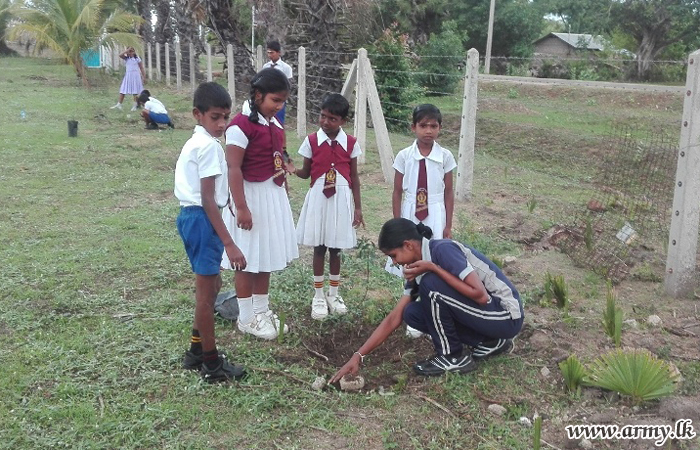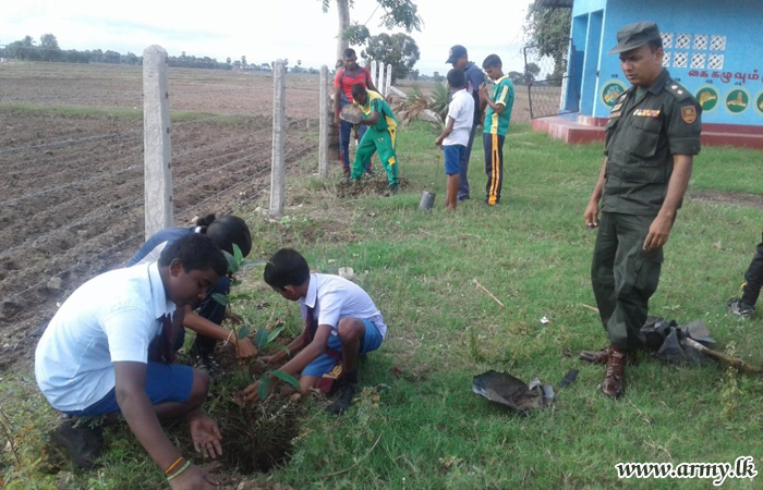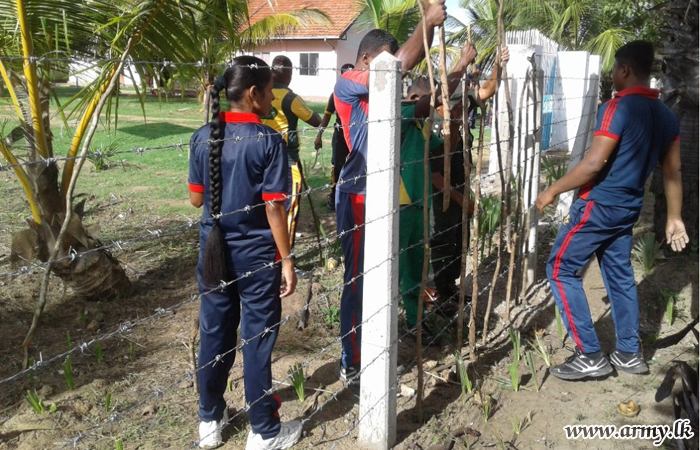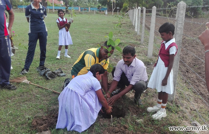 Similarly, troops of the 571 Brigade organized a tree planting programme to plant Jack and Margosa saplings with the participation of school students and teachers at the Pannakkandi GTM School on Monday (8). During the programme, troops also repaired the barbed-wire fence around the school as an extra activity apart from the main event.