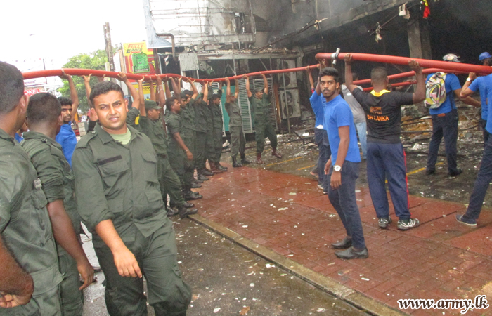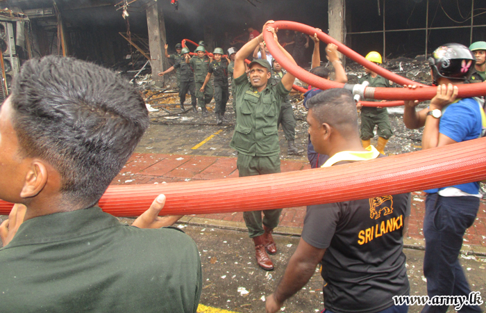 Five Army water bowsers and more than 175 Army personnel, belonging to 142 Brigade, 144 Brigade, 9 Sri Lanka Light Infantry, 12 Gajaba Regiment and 11 Vijayabahu Infantry Regiment at the request of the Police and Fire Brigade on Thursday (11) assisted the firefighters to bring a mammoth fire that erupted in the private clothing complex, ‘Cool Planet’ at Pelawatte, Battaramulla.
