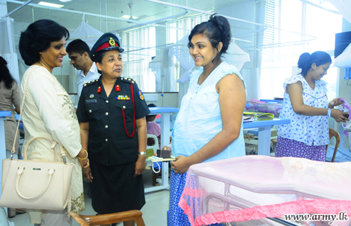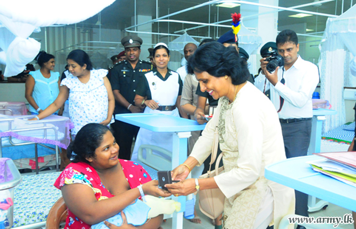 The arrangement saw 4 infants (male) and 6 girl babies born on the Army Day received Panchayuda chains, each worth Rs 9,800/= for boys and pairs of earrings, each set worth Rs 10,800/= for girls respectively. Mrs Senanayake spoke to the mothers of those kids and shared views with them during her visit.