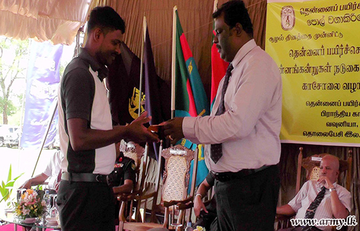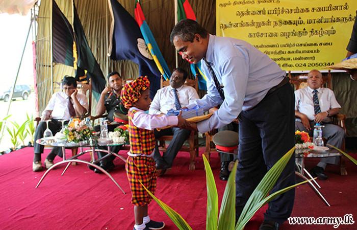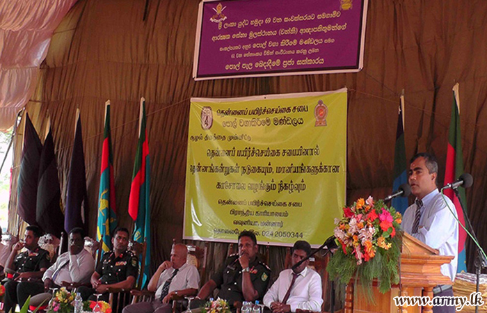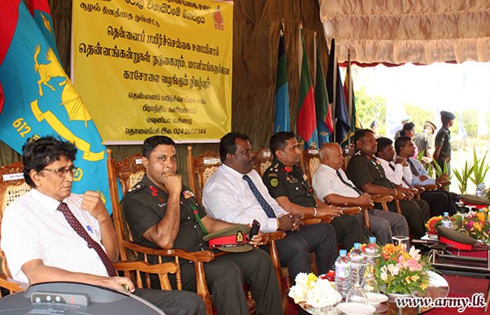 Intended to assist elevate economic prospects of low- income group families, resident in Vavuniya and its suburbs, 61 Division Headquarters of the Security Force Headquarters - Wanni on Friday (12) in collaboration with the Coconut Cultivation Board initiated a programme to distribute coconut saplings and plants of economic value, such as Halmilla, Mee, Bulu, Kumbuk, Woodapple, Tamarind, etc.