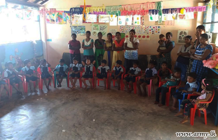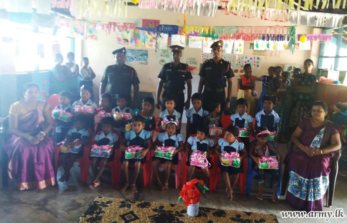 Meanwhile, 7 Gemunu Watch troops under command to the 683 Brigade provided tea and snacks to the kids learning in Kaleiwani Pre-school and Mathusa Pre-school on the same day respectively.