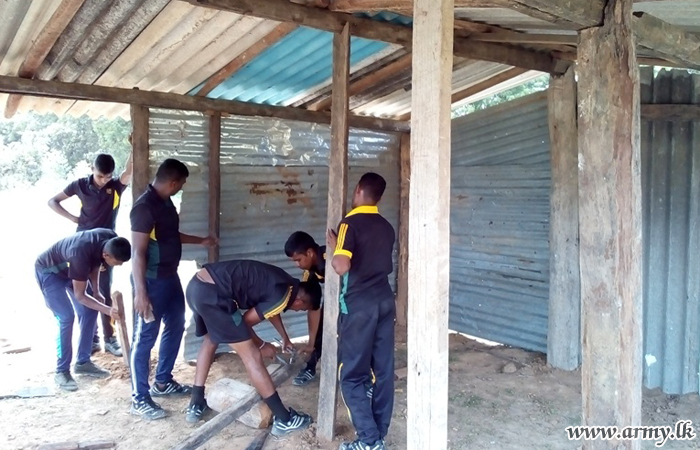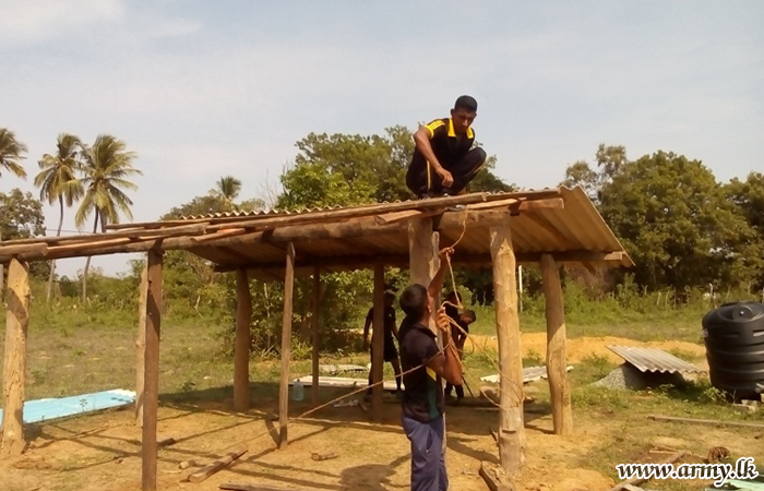 6 Sri Lanka Sinha Regiment (SLSR) troops of the 572 Brigade under the 57 Division of the Security Force Headquarters - Kilinochchi (SFHQ-KLN) considering the humanitarian aspect, put up a temporary house for a physically-handicapped man and his family in the general area of Thottadi.