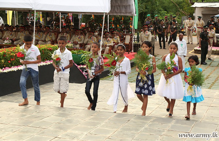 At noon, the day’s Chief Guest was invited to join an All Rank lunch at the men’s club in accordance with formalities. After a while, Major General Silva saluted the memory of all fallen GR War Heroes at the War Heroes’ monument, together with children and family members of fallen War Heroes, Officers and Other Ranks who were present at the commemorative occasion.