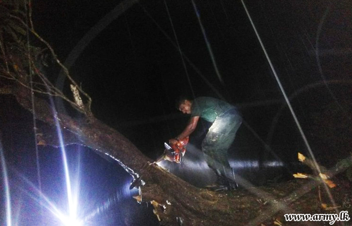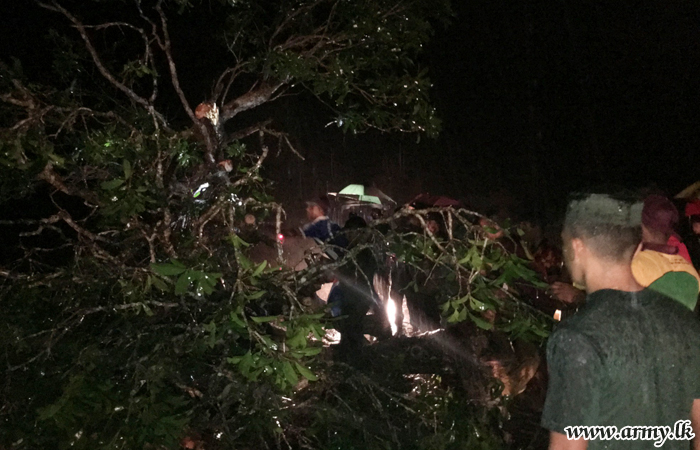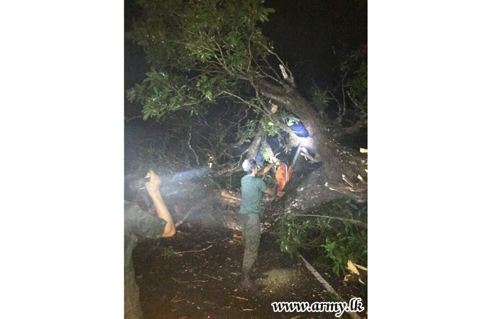 Fallen trees, fronds, tree branches and other paraphernalia that had blocked the passage of the Mankulam - Mullaittivu road and a few other connecting roads were cleared within hours by the troops under the supervision of the General Officer Commanding, 64 Division, Brigadier Jayanath Jayaweera.