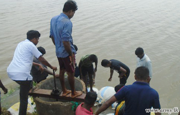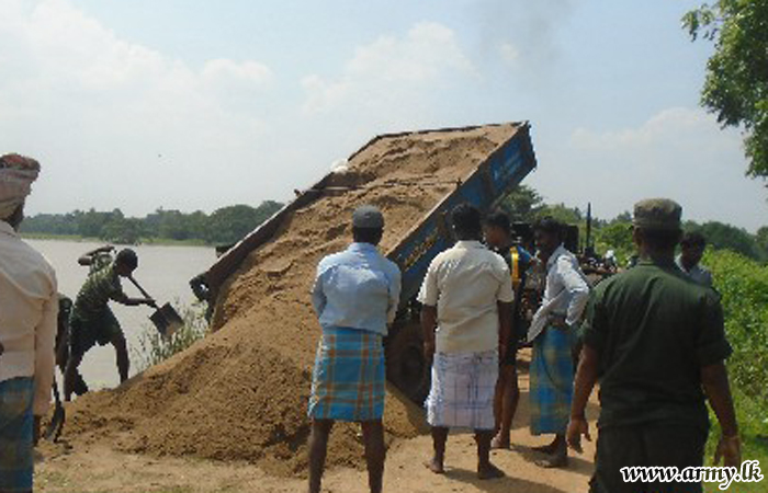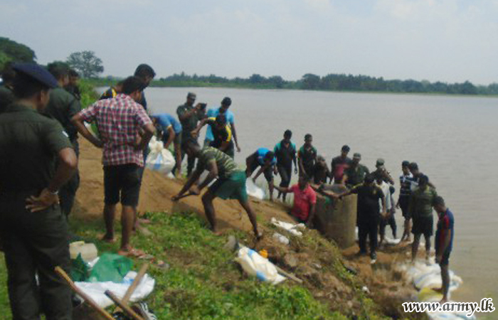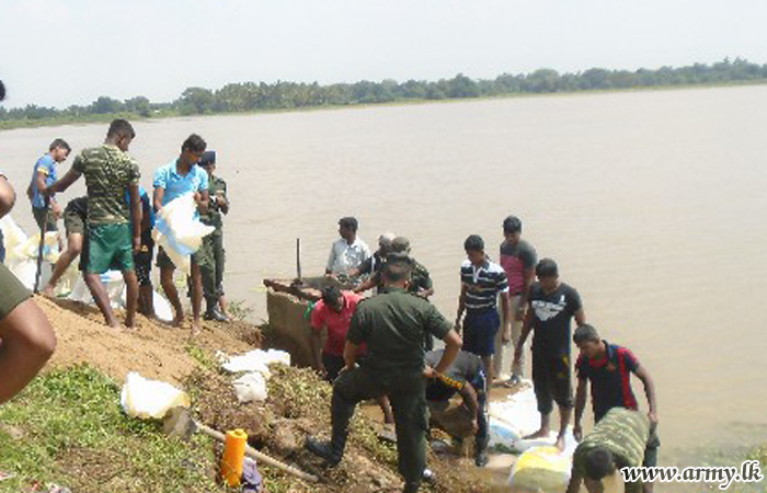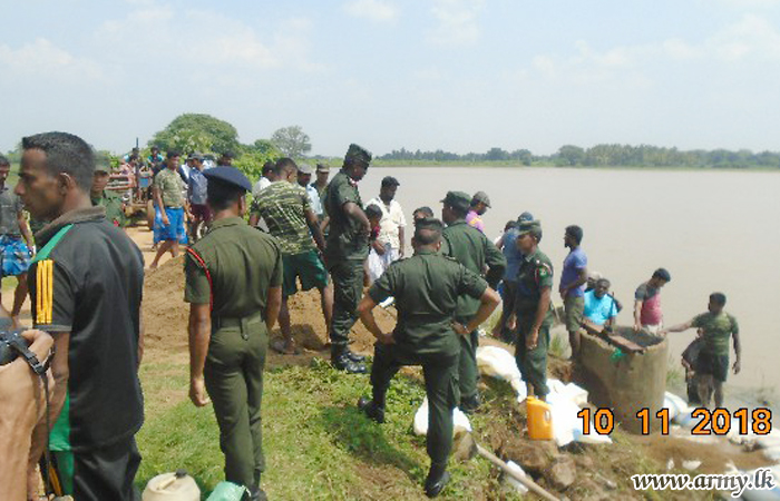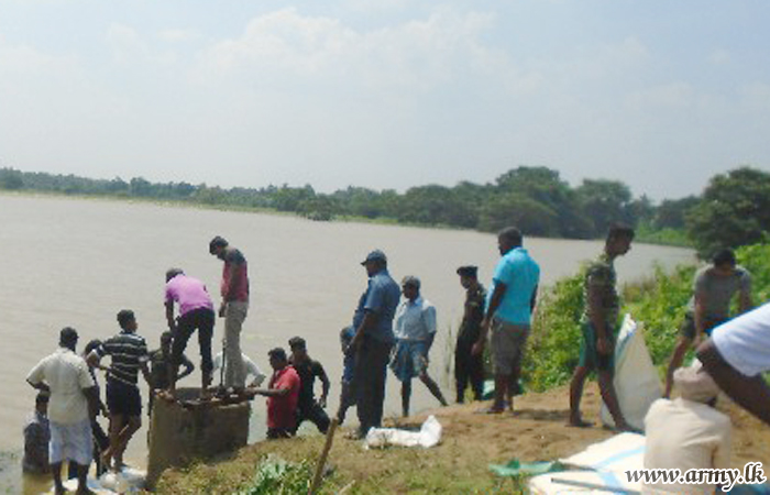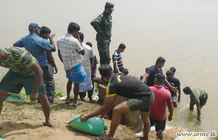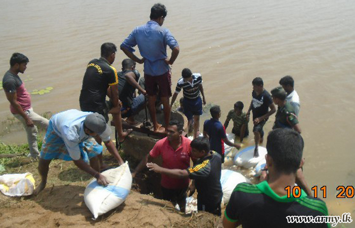 Civilians in Karumpulliyankulam - Manthai East voluntarily joined the troops and worked tirelessly to patch up the bund split which had by then begun leaking water after soil lumps had eroded due to torrential rains.