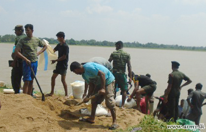 Barely a few hours after the same 20 Sri Lanka Sinha Regiment (20 SLSR) troops of the Security Force Headquarters - Wanni prevented a major disaster attending to a leakage on the Nedunkerni tank bund, another group of soldiers with the support of civilians plastered a split on time in the Karumpulliyankulam tank bund which was about to split due to soil erosion late Saturday (10) afternoon.