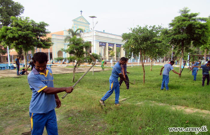 In order to keep this sacred area, used daily by hundreds of devotees, neat and free from Dengue epidemic threats, troops in consultation with the Administrator at Madu Shrine, Rev Father Peppi Sosai carried out the social work and removed garbage and other pollutants from the area.