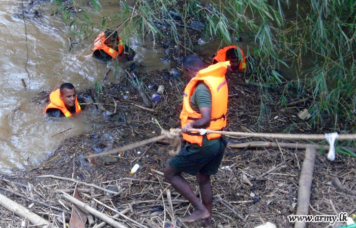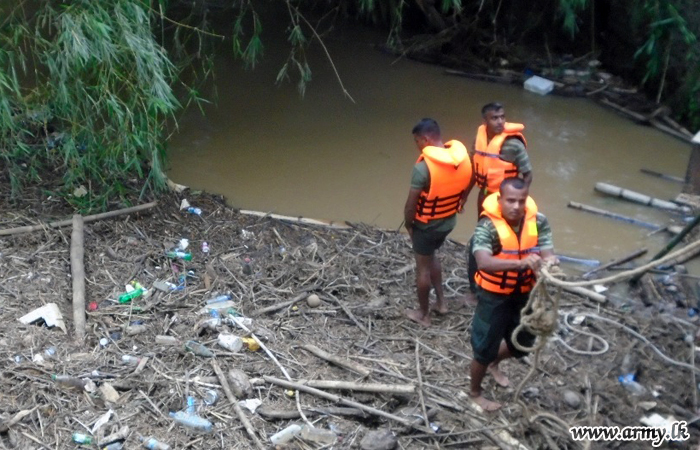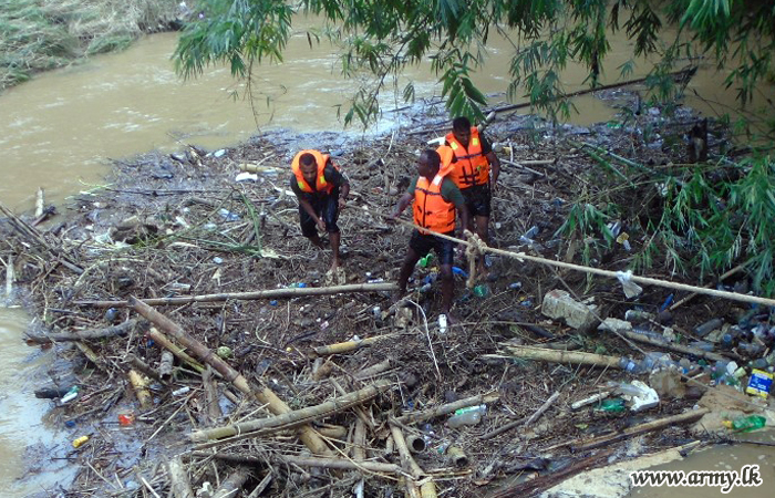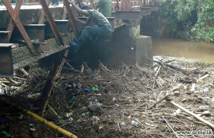A group of 12 Army troops in response to a request made by Kurunegala Disaster Management Centre, 1 Sri Lanka National Guard (SLNG) troops on Sunday (18) promptly removed a heap of garbage that had blocked the water flow in the Koskotuoya (stream) which flows through Mawathagama, Kongoda and enters Thilaka Mawatha bridge.