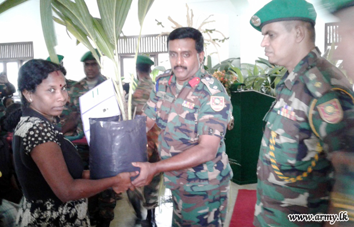 To be in line with the Commander’s conceptual notion, ‘Ranaviru Haritha Arana’ project to coincide with the ‘Wanaropa’ National Tree Planting Campaign, 11 (V) Gajaba Regiment troops of the 651 Brigade under the 65 Division of the Security Force Headquarters - Kilinochchi (SFHQ-KLN) distributed 240 coconut saplings among 120 civilians living in the general area of Pallayarankaddu on Friday (16).