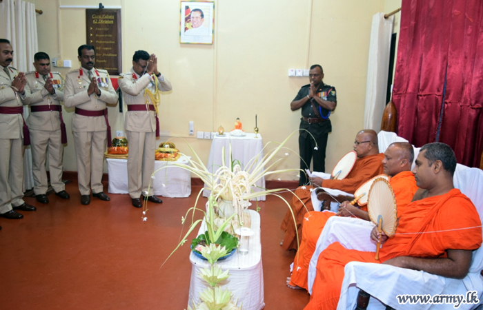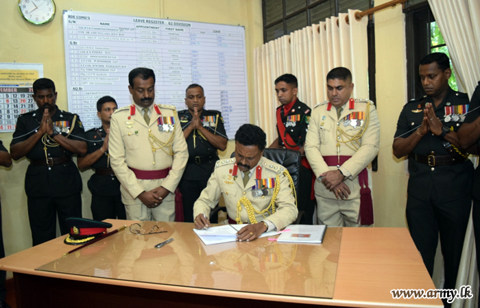 A Guard Turnout and a Guard of Honour presented by 9 Gajaba Regiment (GR) troops greeted him upon his arrival at the 62 Division Headquarters. Ven Millewe Sumanatissa Thero, Ven. Periyakulame Suguna Thero and Ven. Kudahalmillewe Wanarathana Thero performed religious observances and blessed the occasion. He succeeded Brigadier Sanjaya Wanasinghe.