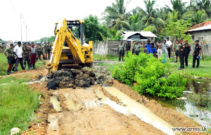 Initial findings confirmed that the lack of a proper water drainage system has caused floods in the village. Following investigations and on the instructions of Technical Officers at the Divisional Secretariat Office, Army troops constructed a complete drainage system, setting up 6 new culverts with the help of backhoe loaders and tractors. 23 families in the area were benefited as a result and the project prevented the area from its recurrence.