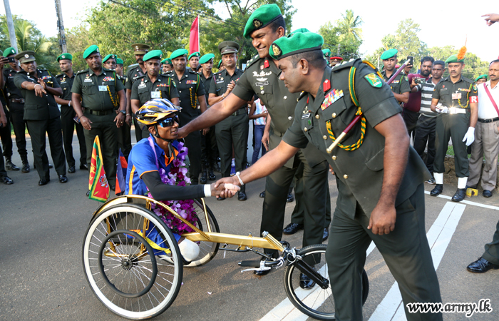Completing the 62 km distance from Ambanpola on arrival, Corporal Karunarathna was warmly welcomed by Brigadier Harendra Peiris, GR Centre Commandant on behalf of the Colonel of the Regiment, the Gajaba Regiment, Major General Shavendra Silva, together with the Deputy Centre Commandant, all Officers and Other Ranks who had enthusiastically awaited his arrival.