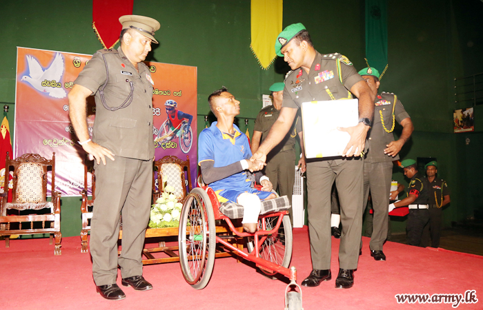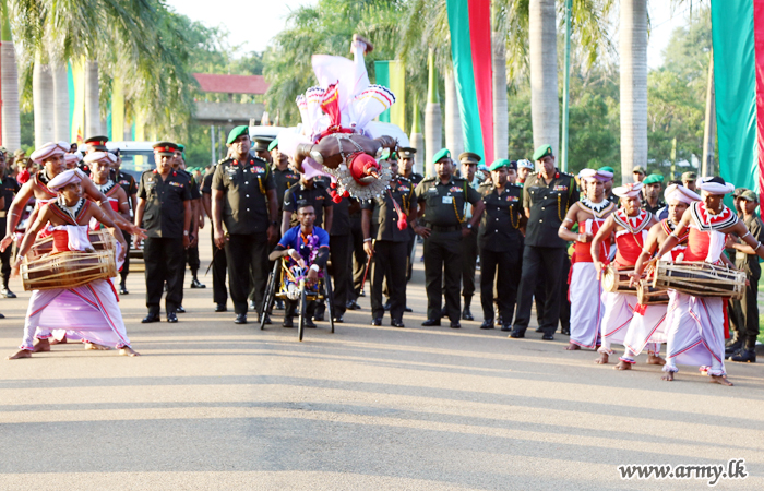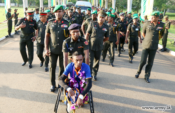 Home of Gajaba at Saliyapura welcomed the War Hero, Corporal Gemunu Karunarathna of 6 Gajaba Regiment (GR) who has undertaken the wheelchair journey, ‘Perseverance’ to cover 576 km and reach Point Pedro when he on his 5th day of the expedition from Ambanpola reached Saliyapura around 5.00 pm on Friday (7) to be received in a rousing welcome of applause and compliments at the entrance to the GR Headquarters.