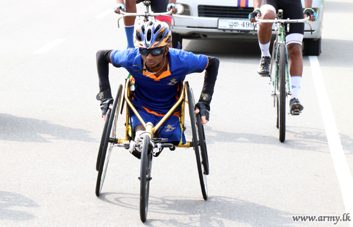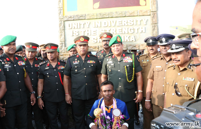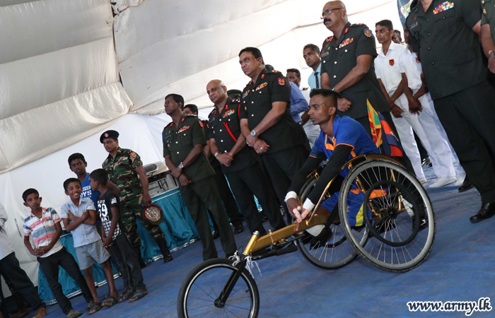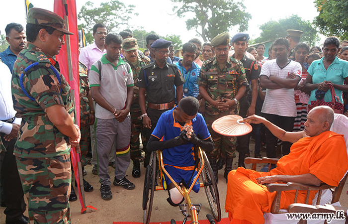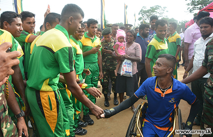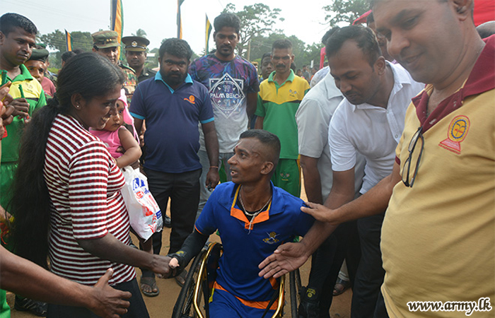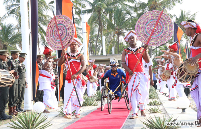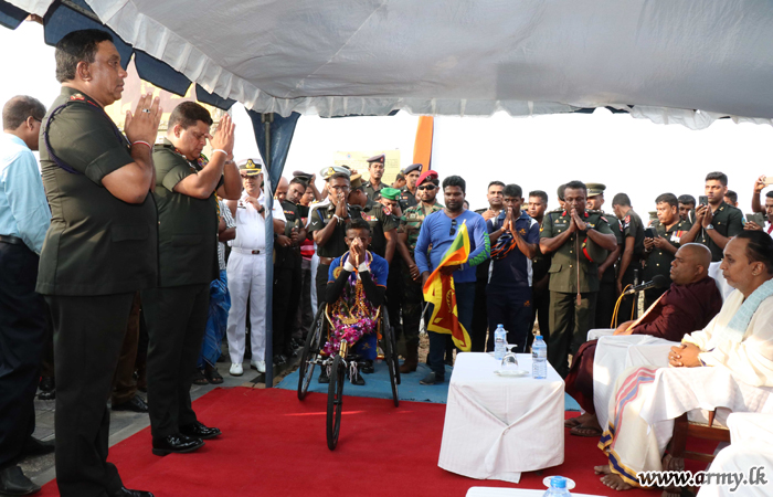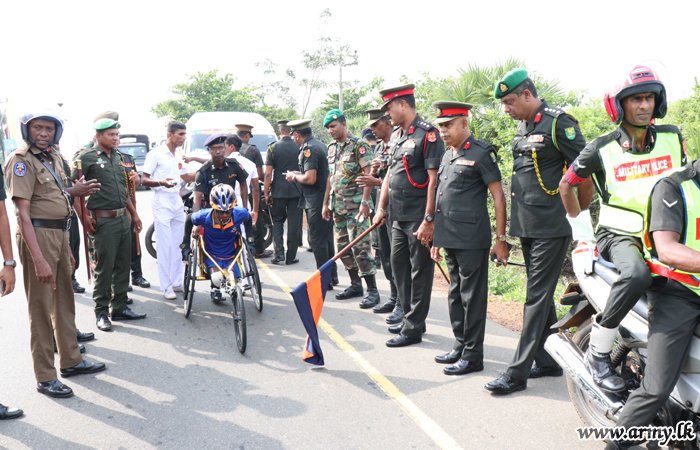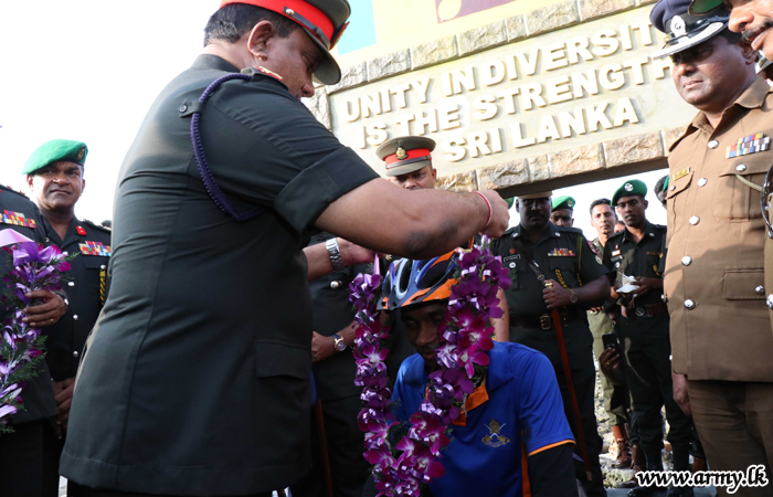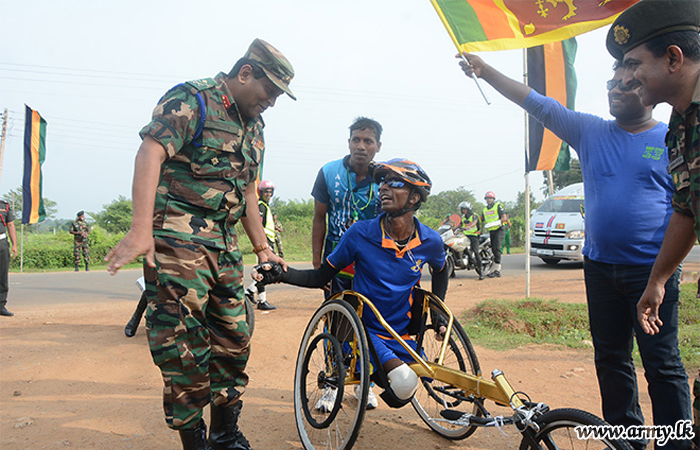 The adventurous wheelchair War Hero, Corporal Gemunu Karunarathne of 6 Gajaba Regiment who challenged challenges in life covering his planned distance of 576 km from Point Dondra to Point Pedro within 8 days arrived at his final destination, Point Pedro on Tuesday (11) to be received in a rousing reception, graced by Major General Darshana Hettiarachchi, Commander, Security Forces- Jaffna, Major General Shavendra Silva, Adjutant General and Colonel of the Regiment GR and a host of officers, other ranks and civilians in the area.