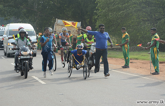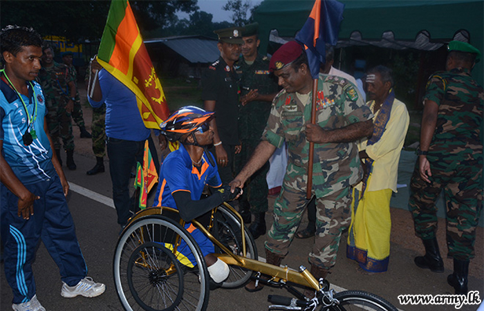 The War Hero, Corporal Gemunu Karunarathne, a resident at Pangolla 'Abhimansala-3' in Pangolla sustained serious injuries while fighting against terrorists on 07 May in the year 2009 and lost his legs. But his unwavering determination and courage did not in any way deter him from undertaking this historic journey amidst blessings of the Commander of the Army who showed up in Dondra to flag off the journey on 03 December.