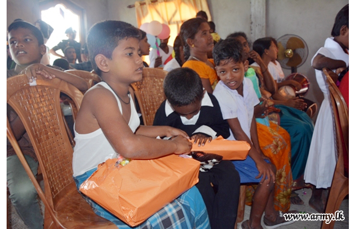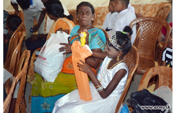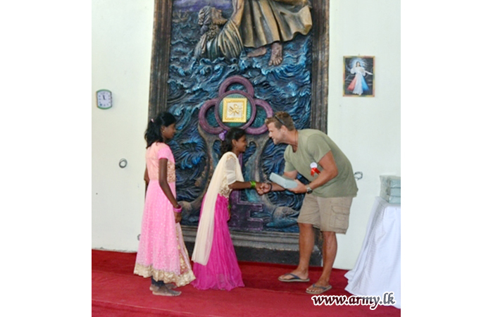 Mannar-based 54 Division troops of the Security Force Headquarters - Wanni (SFHQ-W) in close collaboration with the generous sponsorship provided by the General Manager Communication and Sustainable Development of 'Hemas Lanka PLC' and Executive Director of Hemas Outreach Foundation, Mrs Shiromi Masakorala on Wednesday (19) gave away a large stock of essential school accessories and gifts to needy children in the remote Illuppakadawal village, near Manthai West, Mannar during a brief arrangement at St Peter's Church, Kalladi.