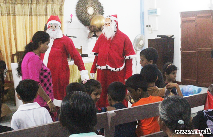 In Jaffna, Army troops of the 522 and 523 Brigades under the 52 Division of the Security Force Headquarters - Jaffna (SFHQ-J) assisted the conduct of Christmas festivities in the Church of South India in Jaffna on Sunday (23). 12 Battalion Gemunu Watch, along with the 4 Vijayabahu Infantry Regiment troops staged Carols, dramas and dancing features in co-operation with 142 children, belonging to 11 Churches. The music for the events was provided by the Army Band and different Army Calypso teams. 5 deserving families were given dry ration packets during the proceedings with the patronage of the Army.
