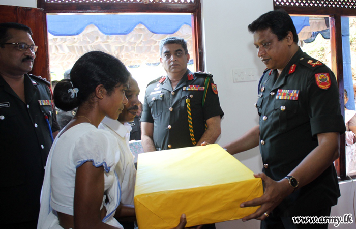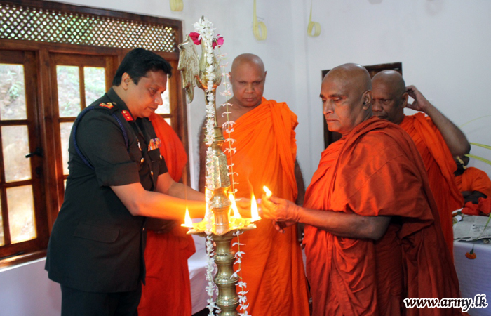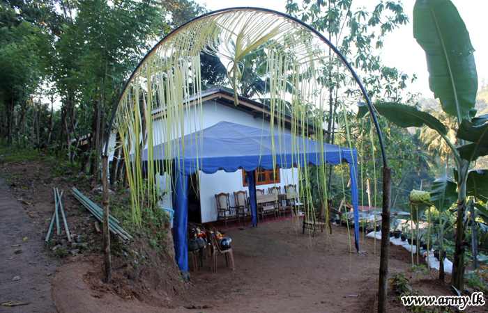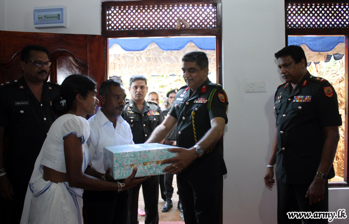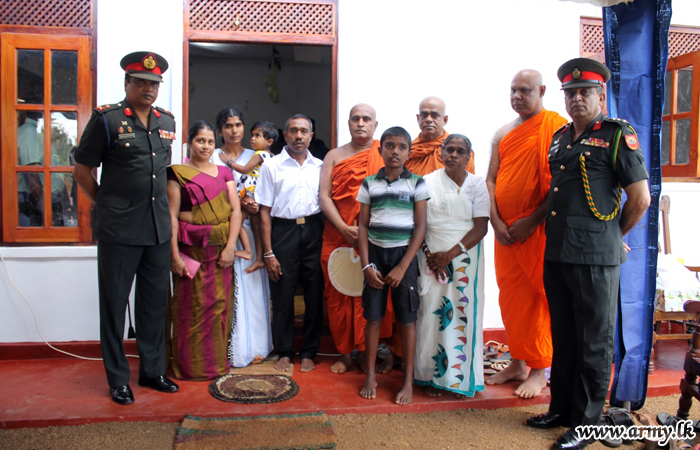 The new home, constructed by Army troops with the support of Ven Embilgama Pangnnatissa Nayake Thero, Incumbent at Hindagala Raja Maha Viharaya who supplied all raw-materials needed for the construction at his cost, was vested in him during a simple ceremony on Thursday (27) amid religious observances.