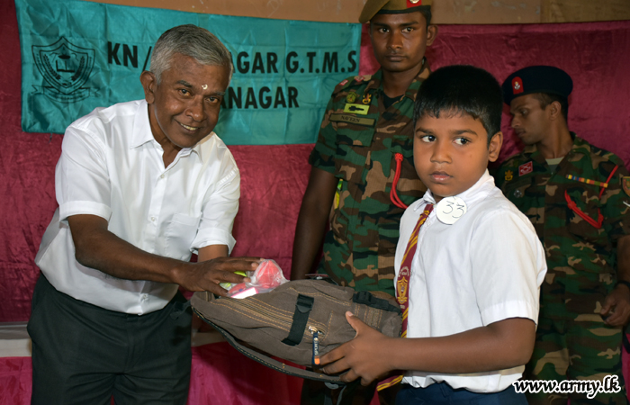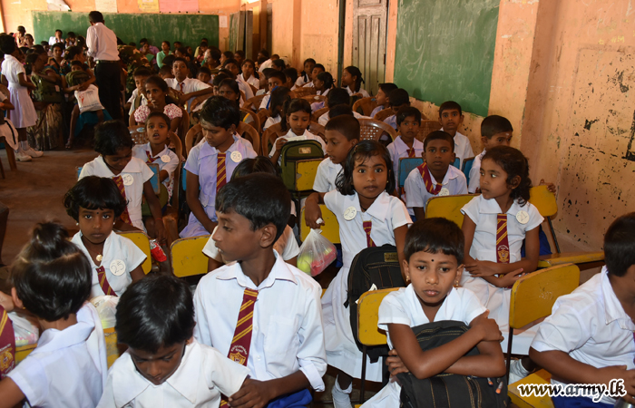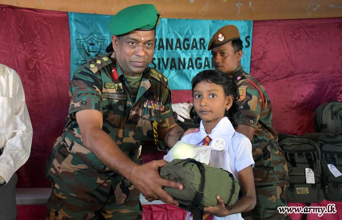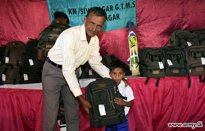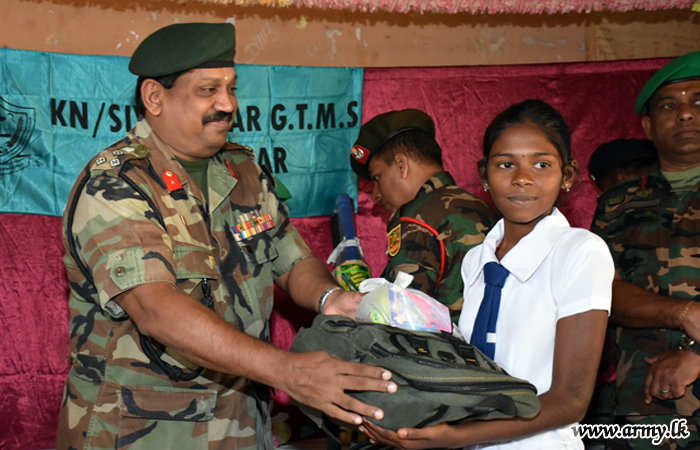 Pooneryn-based 66 Division Headquarters of the Security Force Headquarters - Kilinochchi (SFHQ-KLN), following generosity provided by Kurunegala Businessmen’s Association and the donor, Mr. Suresh Skandarajah on Sunday (6) gave away a large stock of school accessories to 112 flood-affected students in the general areas of Wannerikulam, Kiranchi, Urthirapuram, Shivanagar and Pudumurippu, being served by troops of the 66 Division.