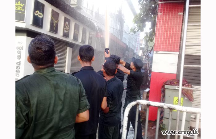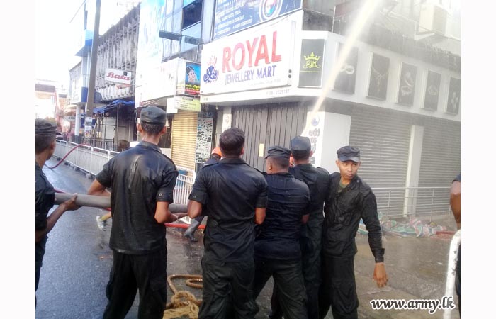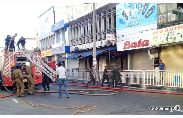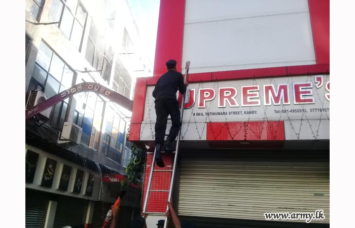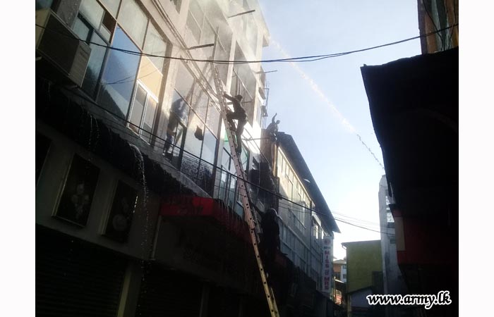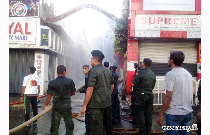2 (Volunteer) Sri Lanka Sinha Regiment (SLSR) troops in Kandy this morning (8) worked hand in hand with fire-fighters and volunteers to bring a raging inferno that broke out in a 4-storied commercial building on the Yatinuwaraweediya in the centre of Kandy town.