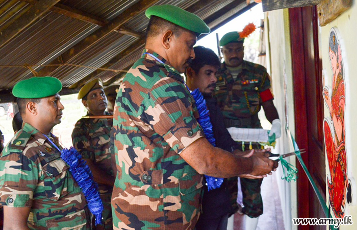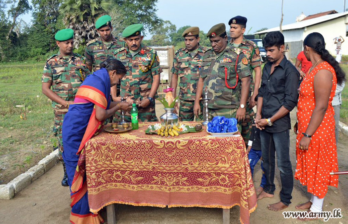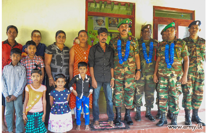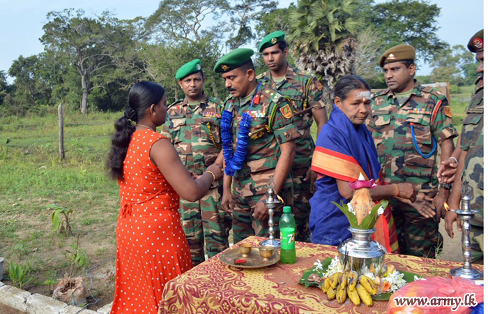 After troops were informed of a desperate family who are living in Olumadu area in the general area of Mankulam without a proper shelter, 574 Brigade Commander with the support of Major General Vijitha Ravipriya, General Officer Commanding, 57 Division in consultation with Major General Ralf Nugera, Commander, Security Forces - Kilinochchi, contacted the said Sri Siddhartha Foundation and sought their sponsorship since 574 Brigade troops were ready to use their technical expertise and labour for its construction, considering the humanitarian aspect of the need.