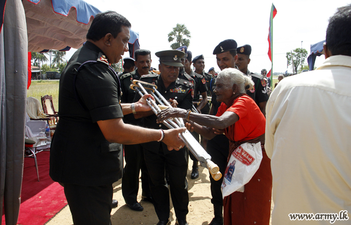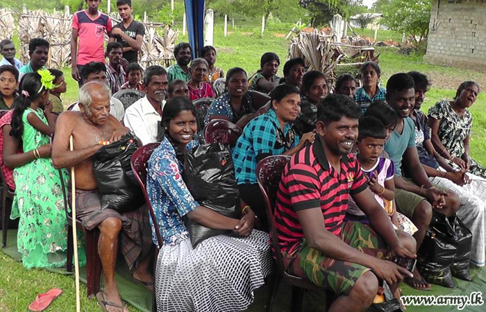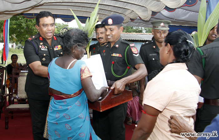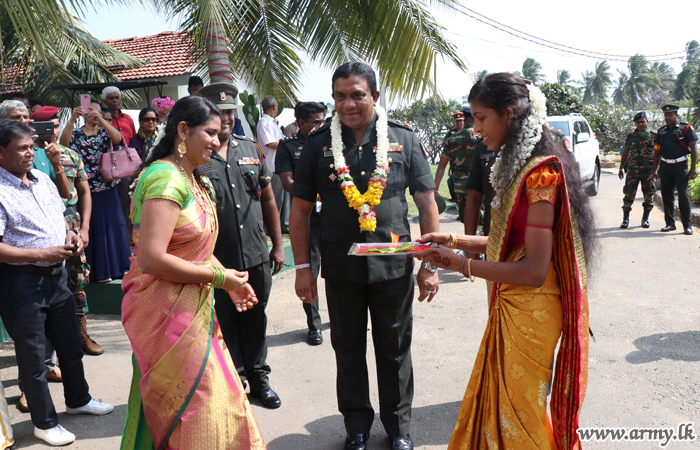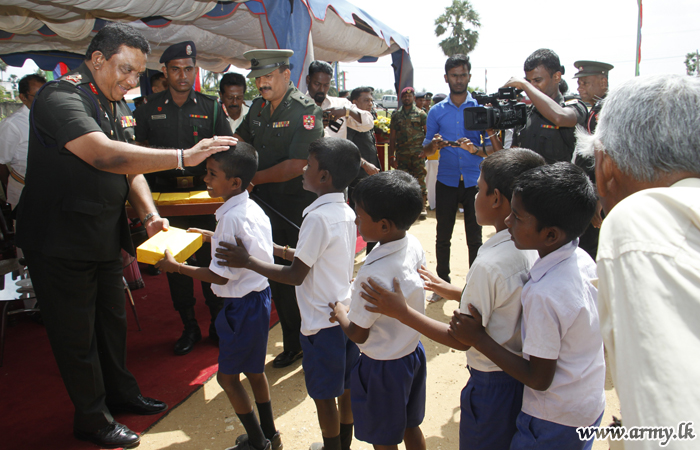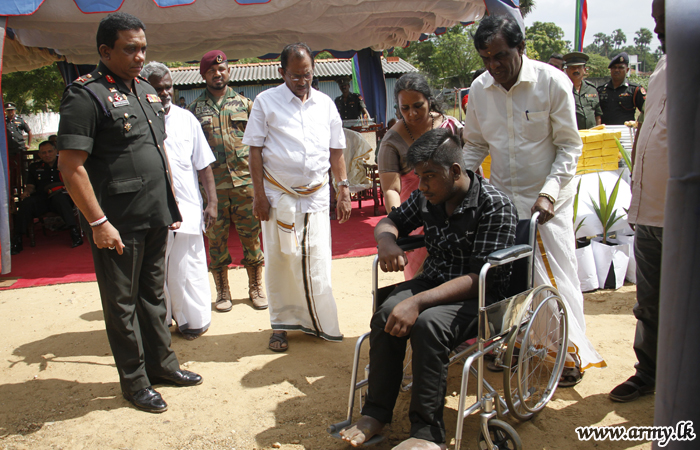 100 children of low-income families in Jaffna on account of Thai Pongal received stationary packs and school accessories while 26 differently able civilians received clutches and a wheelchair during a ceremony at Sri Bhadrakaali Kovil premises at Sangarathai in Wadukkodai, headed by Major General Dharshana Hettiarrachchi, Commander, Security Forces - Jaffna. At the same occasion, troops distributed about 1000 coconut saplings among civilians in order to encourage them for cultivation.
