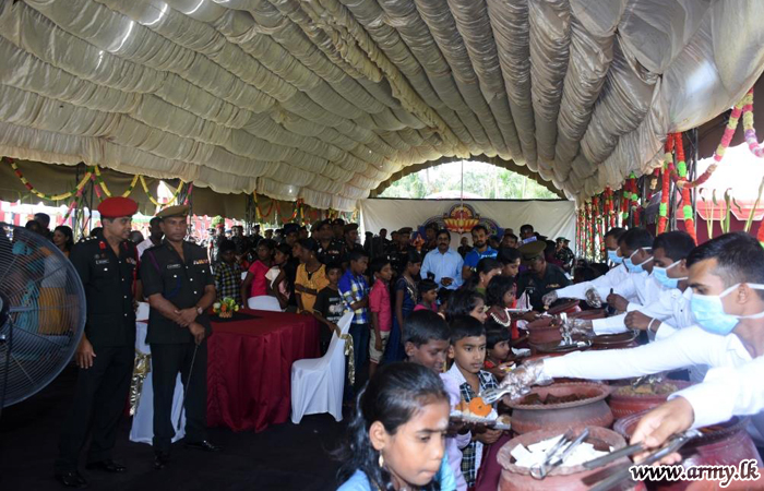 Thai Pongal arrangements at this temple premises launched for the second time included a ‘Dansela’ (free eatery), filled with Thai Pongal sweetmeats and gave away the treat to more than 500 Hindu devotees who came to the location. Major General Ruwan Wanigasooriya, GOC, 59 Division, Brigadier A.S Ariyasinghe, GOC, 68 Division, Brigadier J.A.D.P Jayathilake, Commander, Forward Maintenance Area - Mullaittivu, Brigadier Jayanath Jayaweera, GOC, 64 Division, Brigadier W.D.C.K Costa, Brigadier General Staff, SFHQ-MLT, 641, 642, 643 Brigade Commanders, Commanding Officers of 14 Sri Lanka Sinha Regiment, 23 Vijayabahu Infantry Regiment, 17 (V) Gajaba Regiment, 6 Sri Lanka National Guard and 13 Sri Lanka National Guard and a large gathering of invitees attended the Thai Pongal festivities.