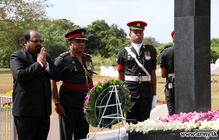 Mr S. Balachandran, Consul General of India in Jaffna, together with Brigadier Ajith Elwatte, Brigadier Administration and Quartering at the Security Force Headquarters - Jaffna (SFHQ-J) on behalf of the Jaffna Commander, paid tribute to those fallen Jawans by placing flower wreaths at the monument.