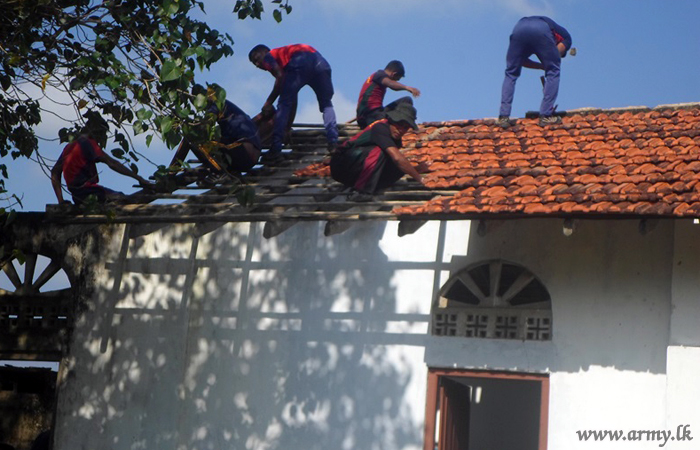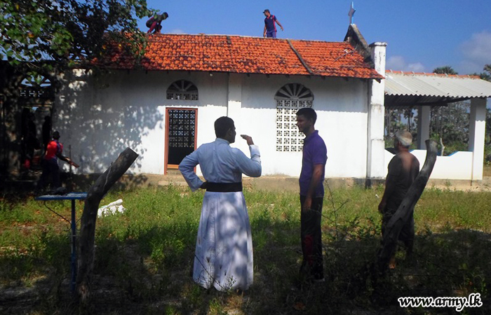 On being informed of the dilapidated condition of the Church roof, 5 Mechanized Infantry Regiment (MIR) troops serving the 661 Brigade of the 66 Division under the Security Force Headquarters – Kilinochchi (SFHQ-KLN) offered their technical and vocational expertise to repair the roof in a Shramadana.