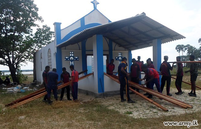A group of 661 Brigade-based 21 Army personnel, including one Officer in another community project assisted the repair of the roof at Pallai Church in the general area of Pooneryn on Sunday (27).