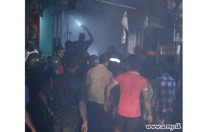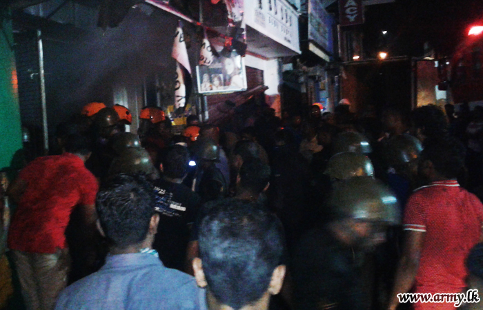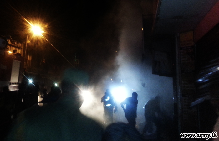 Three Officers and 20 Other Ranks of 8 Vijayabahu Infantry Regiment (VIR) and 2 (Volunteer) Sri Lanka Sinha Regiment (SLSR) under command to the 11 Division of the Security Force Headquarters - Central (SFHQ-Cen) joined hands with fire-fighters and Police personnel to extinguish a sudden fire that broke out at a shop with plastic-wares in Kandy city late Friday (1) evening.