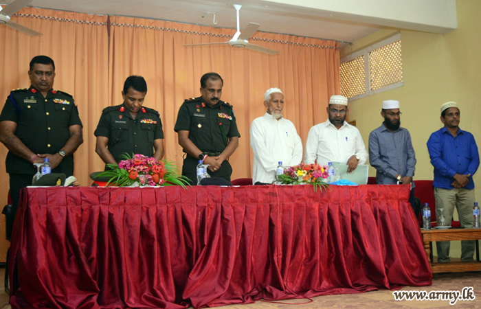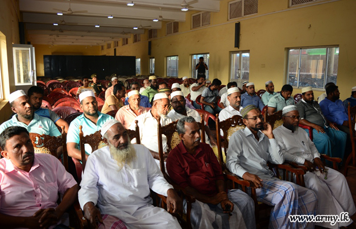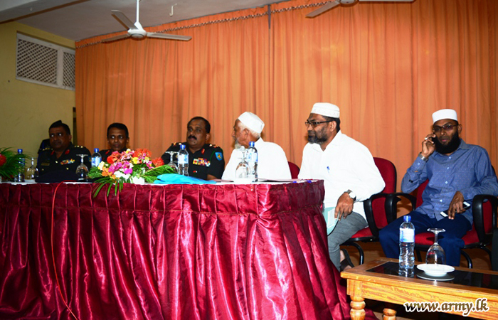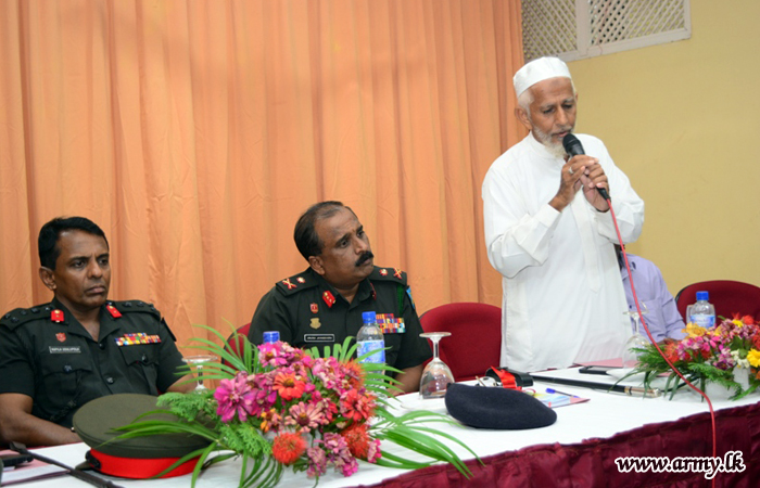 Maulavi A.L.M Ismail, the President of Jamiatul Ulama - Kalkuda, Mr M.M.S Sharook, the Manager of Al-Kimma Organization, General Officer Commanding (GOC), 23 Division, Brigadier W.A.K.B Udalupola, Commander, 233 Brigade, Colonel R Elvitigala and Civil Affairs Officer, SFHQ - E, Lieutenant Colonel S.M.S Samarakoon attended the discussion. |