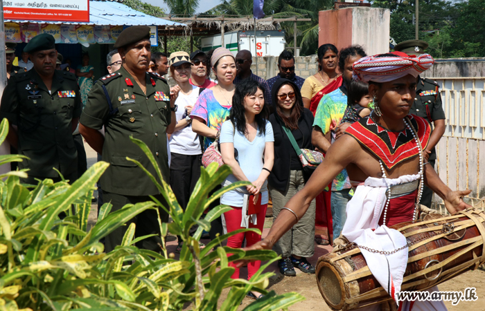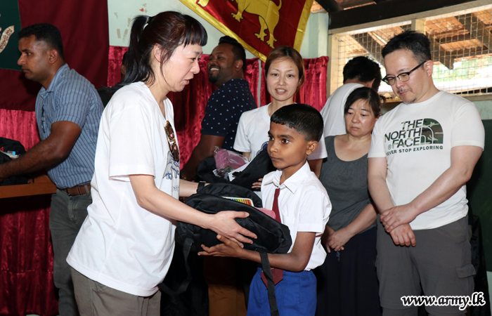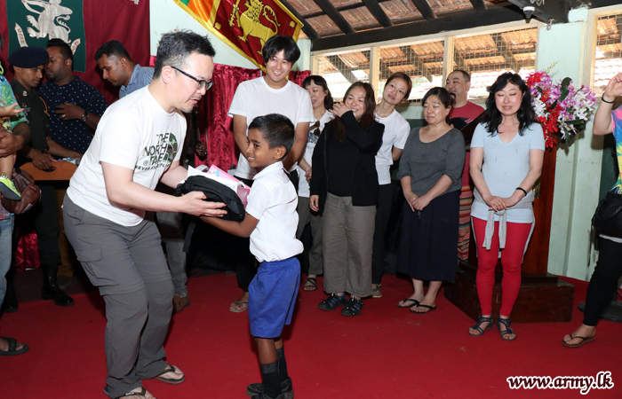 The initiative, launched with the blessings of Major General Darshana Hettiarachchi, Commander Security Forces - Jaffna (SF-J) was attended by Commander 522 Brigade as the Chief Guest, together with a few Senior Officers serving the 52 Division. Each gift packet contained a school bag, writing books, mathematical instrument boxes, pens, pencils, drawing sticks, etc, needed for their studies in the school. Japanese donors enthusiastically mixed with the beneficiaries and talked to them during the arrangement. A brief welcome procession conducted them to the school building before the distribution began.