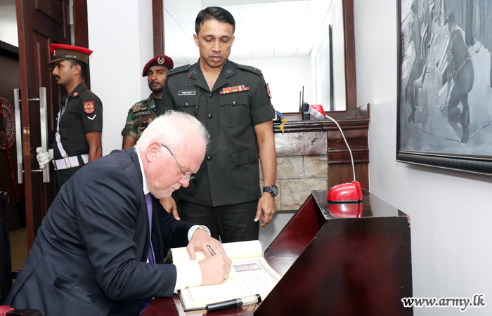 The ambassador was educated on ongoing reconciliation process, rehabilitation, resettlement and multifaceted social welfare projects being conducted by Security Forces in Jaffna for the greater benefit of civilians in the peninsula. Major General Hettiarachchi towards the end of the interactive meeting presented a memento as a token of goodwill. The ambassador left his compliments in the Visitors' Book at the SFHQ-J before he left the premises. |