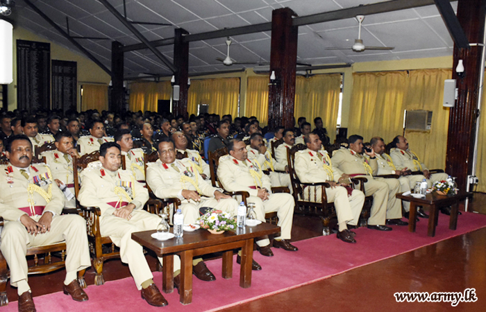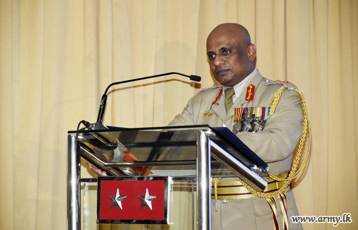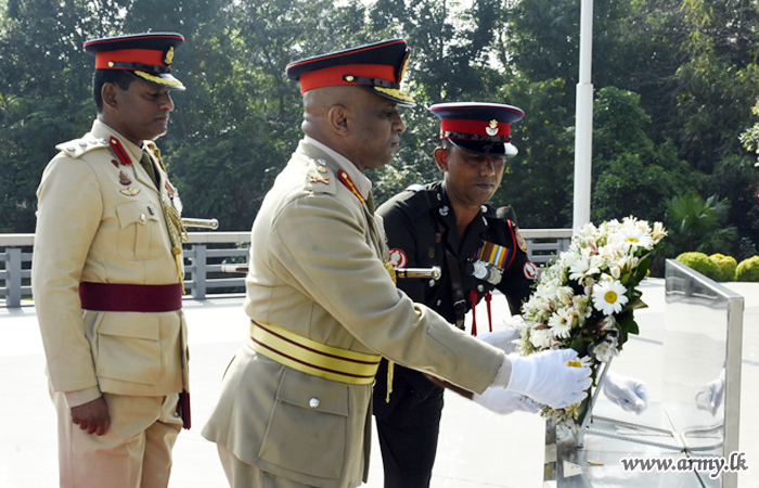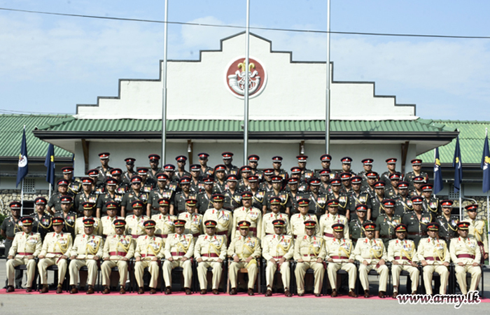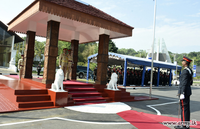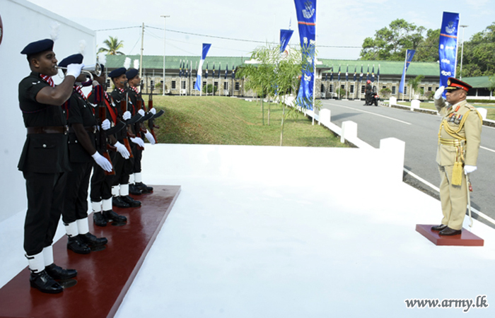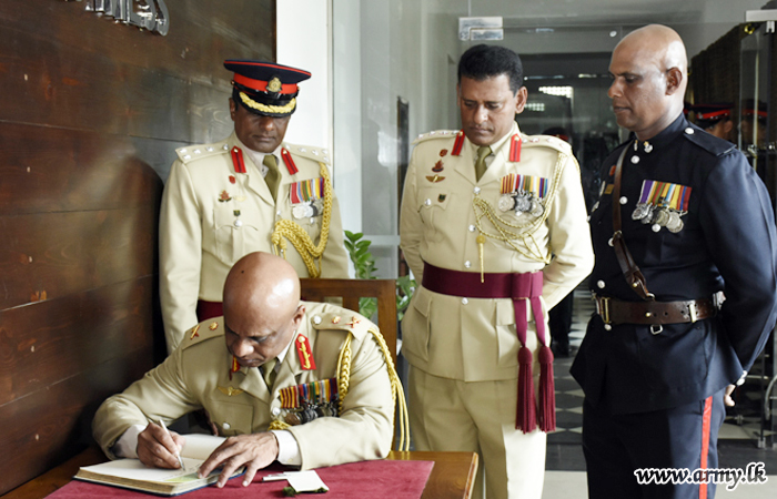 At the main entrance to the SLLI Headquarters, SLLI Centre Commandant, Colonel D.A.K Dissanayake, together with the senior Brigadier Jayanath Jayaweera in the company of the SLLI mascot, 'Kandula' extended a warm reception before he was greeted to a typical Guard Turnout. By placing a floral wreath at the SLLI War Heroes' monument, he at first paid his respect to fallen War Heroes before he was ushered to take the salute in the Guard of Honour that ensued afterwards. Major General Gunarathna a few minutes later addressed the troops and spelt out his vision in future and posed for a group photo in order to add eternal memories to the occasion.