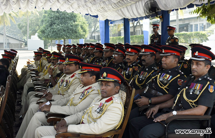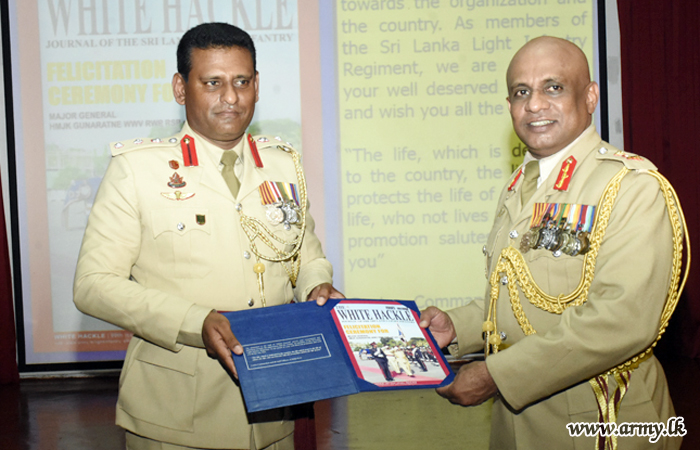 The day’s reception culminated with award of a memento that carries all the photos of the occasion to the newly-promoted Major General by the Centre Commandant SLLI on behalf of the Colonel of the Regiment, Major General Ruwan Kulathunge, currently on an overseas assignment.