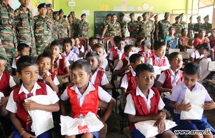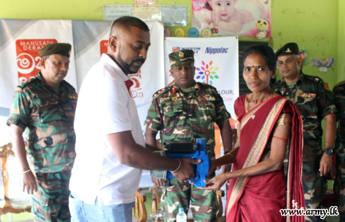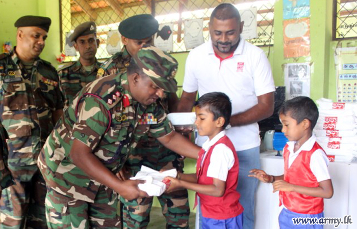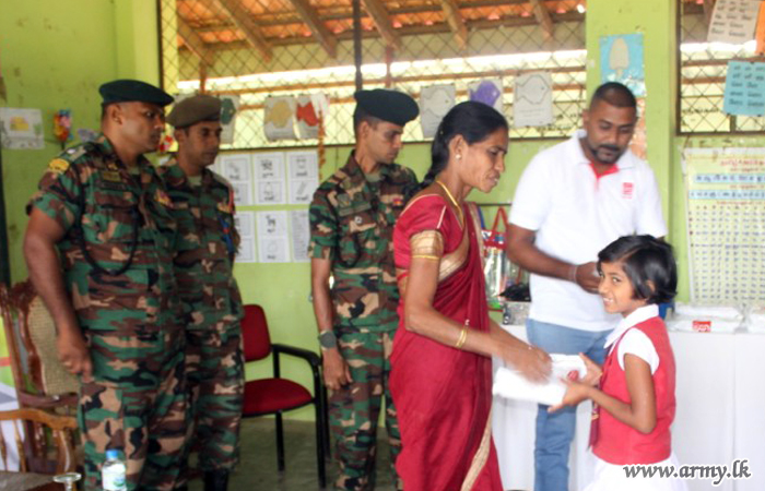 55 more flood-affected students in Kilinochchi, following coordination made by the 57 Division through the sponsorship of “Manusath Derana TV' received school accessories during a programme at Kilinochchi Thampirasa Vidyalaya on Friday (15). In addition, a computer, water pumping electric water and a few buckets were also donated to the school in the same ceremony.