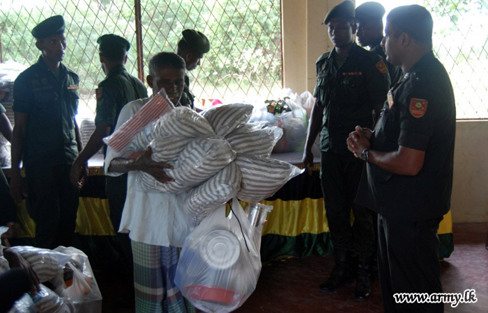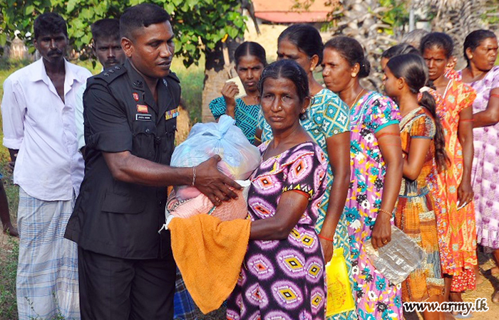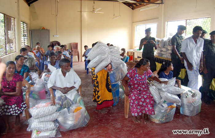 A total of 66 flood-affected civilians in Thadduvankoddai and Murusumoddai areas in Kilinochchi received dry ration packets, containing noodles, milk powder, sugar, tea, dhal, soya meat and rice, following sponsorship, provided by Mr Kanthan of Kilinochchi at the request of Major General Vijitha Ravipriya, General Officer Commanding, 57 Division.