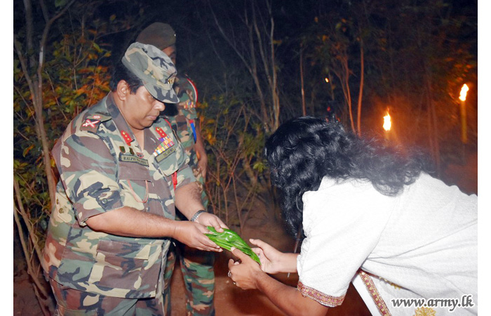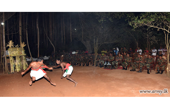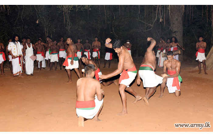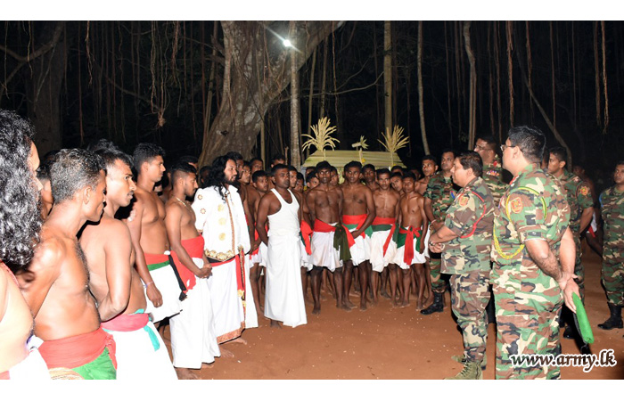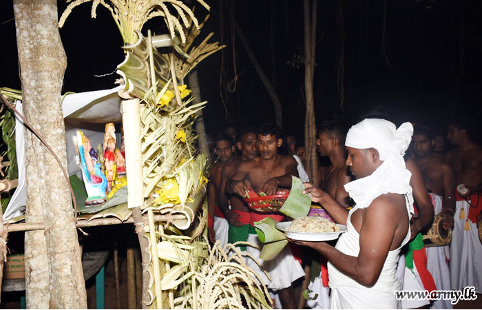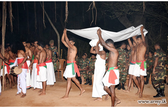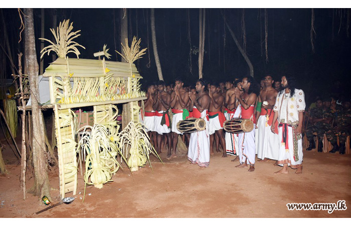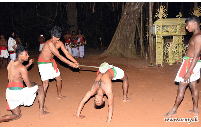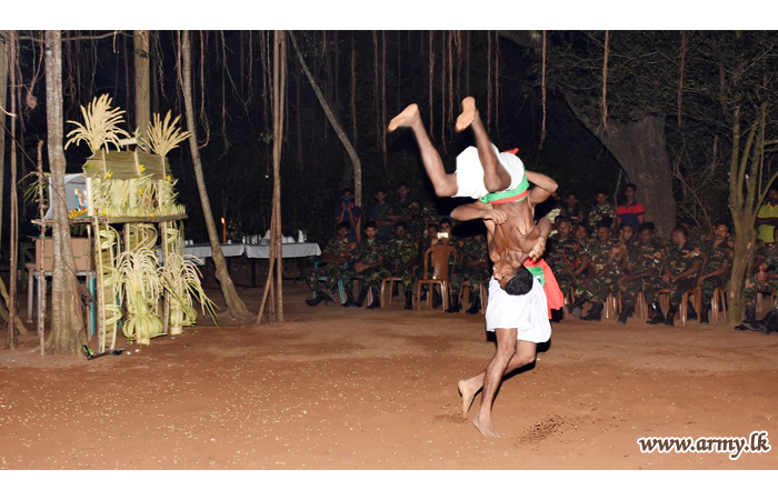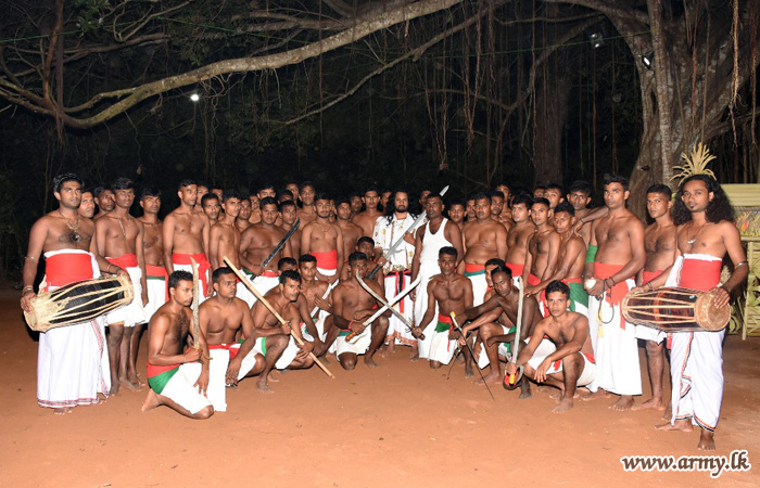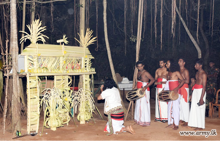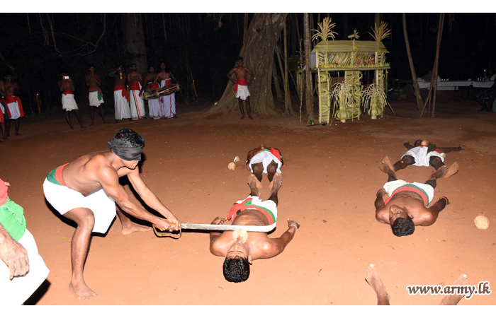 According to traditions that had been practiced for years, special rituals were dedicated to different deities before the main event. Kala Vibhushana Devinda Laksiri Ranasinghe of Ritigala Sinhakkara dynasty, along with his team, volunteered to extend lavish support to groom those 55 soldiers from various battalions serving in SF Kilinochchi area.