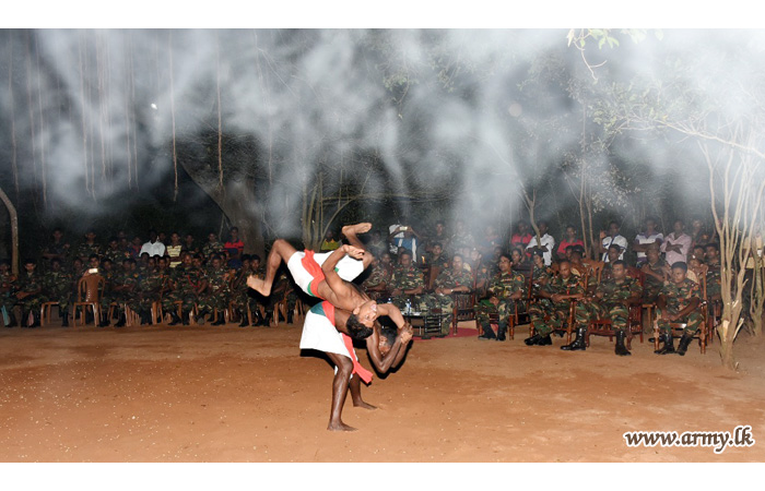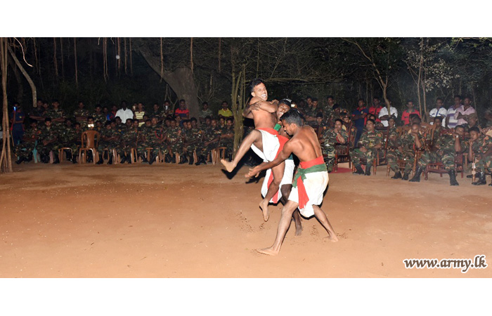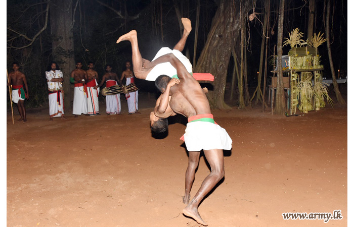 Having undergone strenuous training for months, a team of soldiers serving in Kilinochchi showed their colours in an exhibition show of traditional Sri Lankan martial art, Angampora. The event, Rawana Ranakeli Pooja, held at the Security Force Headquarters - Kilinochchi (SFHQ-KLN) on Friday (22) was the maiden show that displayed their skills in public.