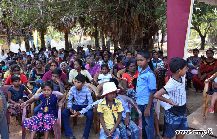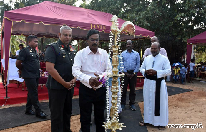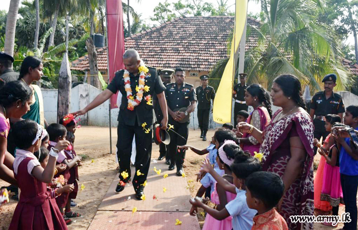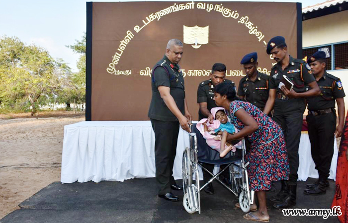 Considering hardships, experienced by 20 pre-school kids at Vallaimadam and Ampalawanpokkanai pre-schools in Puthumathalan, 14 VIR troops under the guidance of Colonel C.S Munasinghe, 681 Brigade Commander volunteered to foot the cost of those school accessories, needed for 20 kids and a wheelchair, needed for a physically handicapped child in the area.